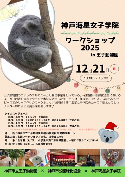 王子動物園のコアラのエサであるユーカリの栽培過程で発生した木材を活用して、神戸海星女子学院の学生によるキーホルダー作りや、クリスマスにちなんだビーズでのリース作りのワークショップを開催します。また、コーラス部とクラシックギター部による演奏会も開催します