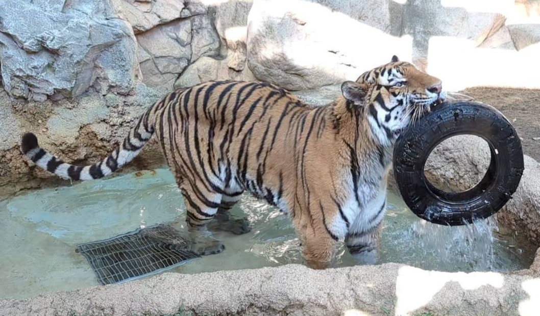 ・メスの「レーニャ」はキリッとした顔立ちで縞模様のコントラストがはっきりした非常に美しいトラ。岩場から見下ろすその姿はもはや女王の風格。放飼場から寝室になかなか帰ってこないこともあり、さすが「猫(科)は気まぐれ」と思わせられる。