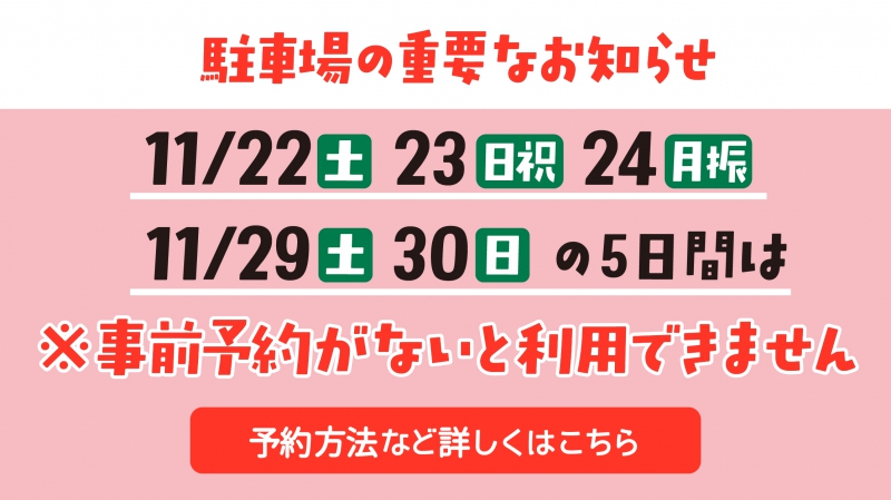 11/22(土)、23(日祝)、24(月振)、29(土)、30(日)の5日間は全区画が予約制です。予約日の14日前から予約可能となりますので、ご利用の方は下記からご予約下さい。 https://www.city.kobe.lg.jp/a76835/202509shakaijikken.html[予約についてはこちら]