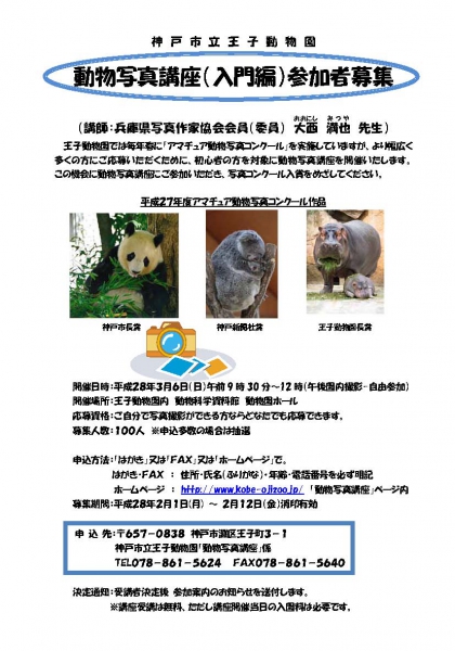 当園で毎年開催している「アマチュア動物写真コンクール」に、より多くの作品をご応募いただくため、動物写真の撮影手法や注意点をわかりやすく解説する初心者向け講座の参加者を募集します。