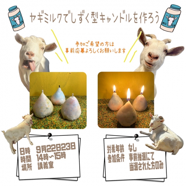 【終了】9/22・9/23 ヤギのミルクでしずく型キャンドルを作ろう!