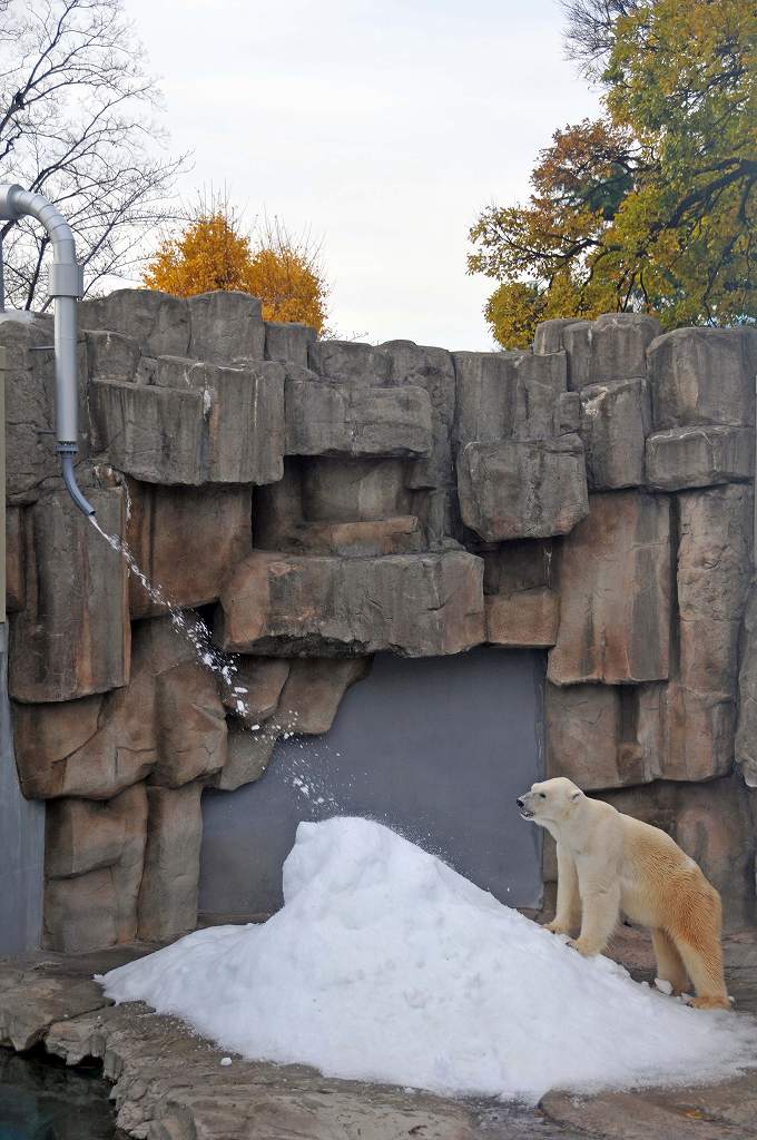 降雪機を設置したことで、北極圏の流氷域や海岸に生息しているホッキョクグマが、野生と同じように雪のある運動場で過ごしている様子がご覧いただけるようになりました。